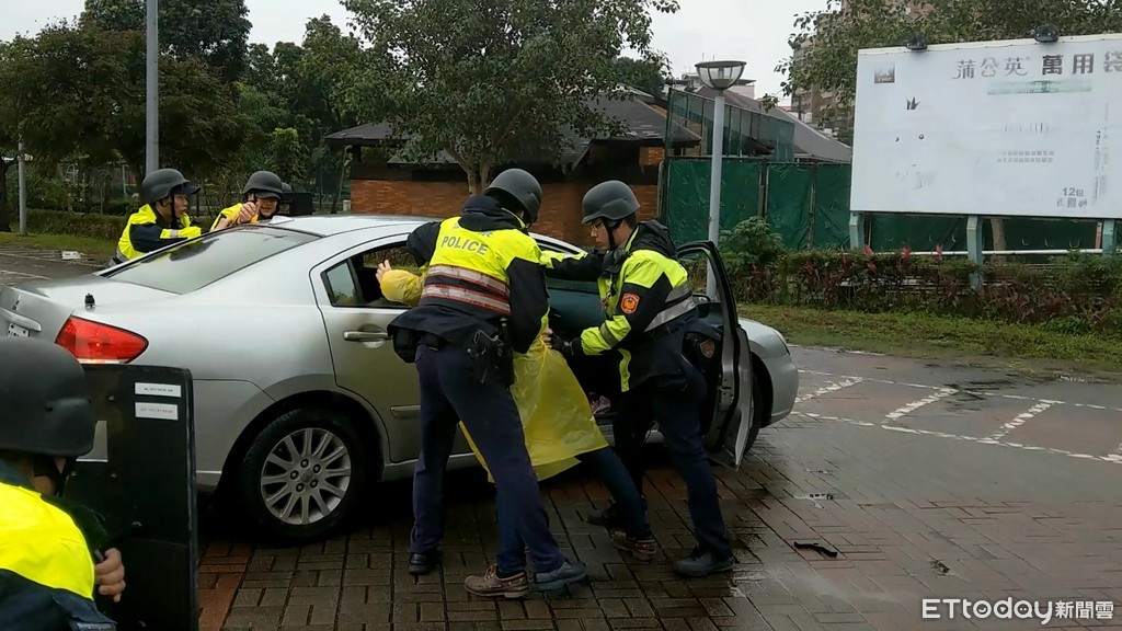 演練中2名歹徒戴面具持槍闖入土城農會,搶劫得手假鈔20萬元後駕車逃逸,一路從土城飛車到板橋轄區,經警方啟動快打部隊實施攔截圍捕,在板橋區板樹體育館將歹徒攔截圍捕到案。