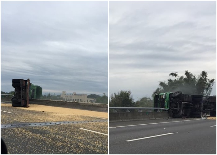 國3北上351公里處大貨車翻覆,一輛載著飼料的大貨運車,不知什麼原因自撞護欄,大卡車翻覆後,車頭損毀懸空在外側護欄上,載送玉米粒噴滿一地,貨櫃整個掉下邊坡摔爆裂開,38歲盧姓司機也因撞擊力道及車頭翻倒,被甩出車外一度找不到人,最後發現人掉落約16米高邊坡樹林,一動也不不動,已經沒有意識。