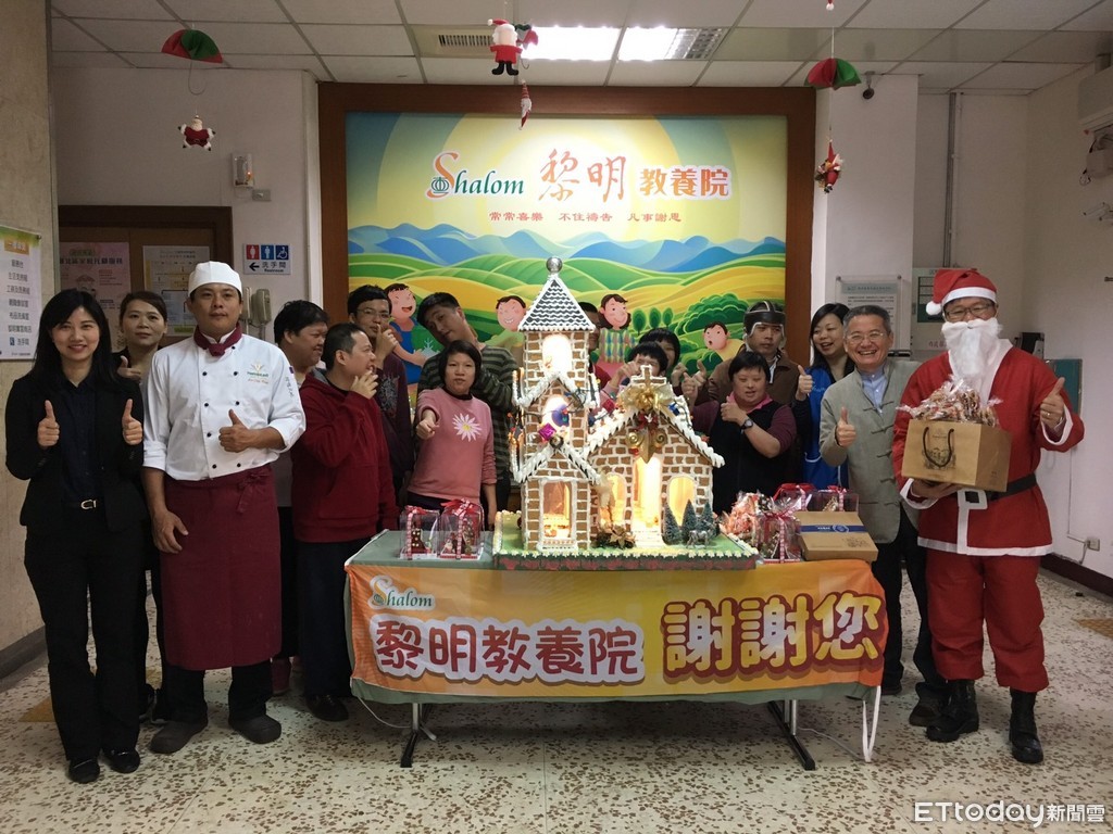 ▲花蓮理想大地飯店康富雄總經理偕同林景泉協理及雅理文化藝術基金會,一同致贈黎明一座70x70公分的薑餅屋,林景泉協理更扮演聖誕老公公發餅乾給院生,讓院生們提前歡度聖誕節。(圖/黎明教養院提供 下同)