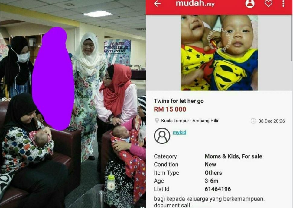馬來西亞吉隆坡一名20歲女子與18歲男友偷嘗禁果後生下一對雙胞胎,事後還狠心把孩子丟在網路上販售1.5萬令吉(約新台幣11萬元),被警方逮捕後也毫無悔意,她甚至直嗆「我不想養,但別人也不能免費帶走我辛苦生下的孩子。」