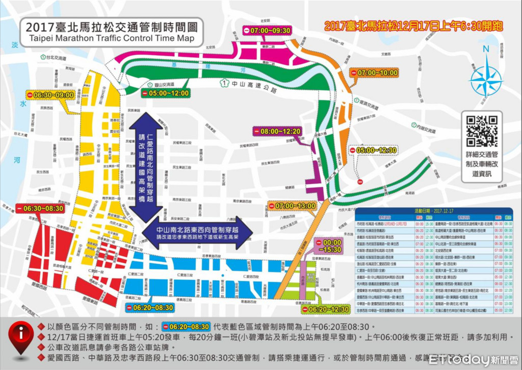 2017台北馬拉松17日即將在台北登場,台北市警察局交通大隊為因應活動進行,將在17日清晨5點至下午1點將管制台北市諸多重要道路,禁止車輛、行人、自行車通行,預估參加民眾約2萬7千餘人。
