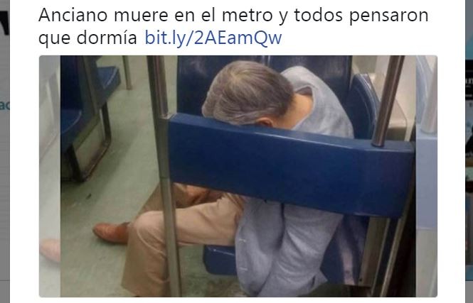 墨西哥一名70歲老伯伯日前搭地鐵坐在博愛座上,頭靠欄杆一坐就是幾個小時,其他乘客以為他一定是睡得太熟,沒有人察覺有何不妥。直到晚上11點45分,地鐵職員已經準備下班,在最後一遍巡邏時發現老伯遲遲沒有下車,怎樣叫都叫不醒,才驚覺原來老伯已經離開人世了。