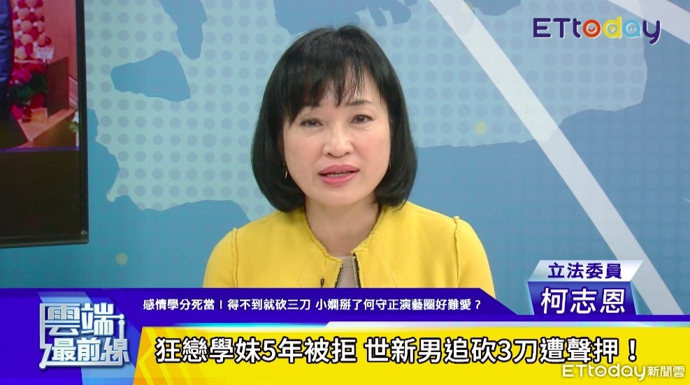 就讀世新英語學系三年級的陳姓男學生,追求同校二年級企管系石姓女學生不成,竟在校內拿水果刀追砍對方,震驚各界。對此,國民黨立委柯志恩13日上《雲端最前線》節目分析,陳男應是「知覺情緒處理上出現短路」,而情感是人生必經課題,平時就應做好身、心靈舒緩,別害怕「講出來」,也盼透過立法,讓女性免於長期的精神、身體上傷害。