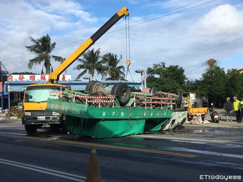 ▲大貨車行經台9線438公里彎道處,疑因車輛爆胎致車輛翻轉180度橫躺北上車道上。(圖/台東縣警察局提供 下同)