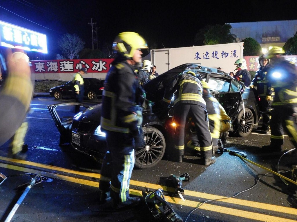 台中市消防局表示,13日晚間接獲車禍報案,派出協和、西屯、工業區、黎明、春社分隊出動消防車3輛、救護車4輛,人員共26人,晚上9點22分抵達安和路57之2號,現場有3名傷者受困車內,發現貨車司機車頭凹,司機受困無法動,BMW駕駛及左後方乘客也卡在車裡。