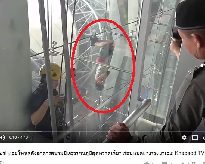 泰國曼谷蘇萬那普國際機場上演一段「倒掛特技」,一名來自歐洲的外籍女子倒掛離地約20公尺的鋼樑上,還拒絕機場工作人員前來搶救,力氣逐漸消失,最終在乘客與救援人員30多人眼前墜地,所幸掉落在早已準備好氣墊上才撿回一條命。