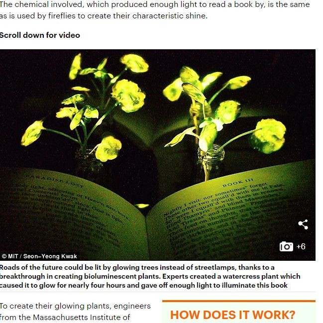 綜合外媒報導,麻省理工學院的一個「植物納米電子學」團隊,將一種特殊的「納米粒子」注入豆瓣類植物的葉子中,讓其發出近4小時的光線,這光線足以照亮書本。該研究的資深作者Michael Strano表示:「我們是希望培育出一種像檯燈一樣的植物,不用插電的燈。光線是由植物本身的能量代謝驅動。」