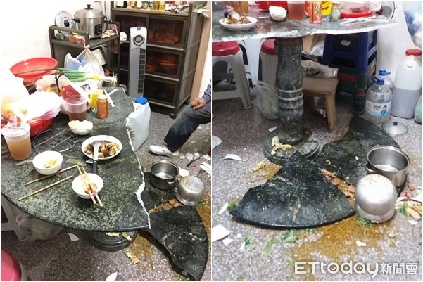 許漢寧說,這張大理石桌家人用了30年,也算是夠本了。照片中,大理石桌從中裂開,一半的桌面因承受不了「滷肉的重量」因而崩壞掉落地面,還應聲再碎成2塊;而整桌的菜也隨著斷裂的桌面摔到地板全打翻,廚房的地面瞬間一片湯湯水水。