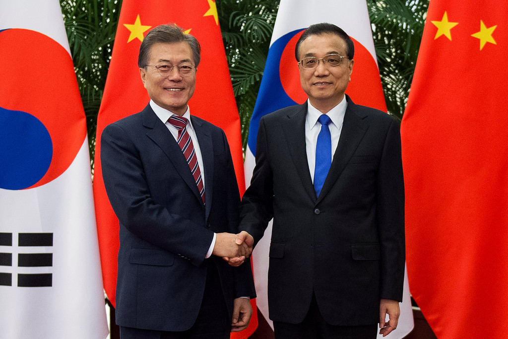 南韓總統文在寅正在中國進行國事訪問,15日下午於北京人民大會堂與中國國務院總理李克強進行會晤,雙方同意將會重啟溝通,並加強2國經濟貿易合作,啟動中韓自貿協定第二階段談判。李克強表示,中方願同韓方「相向而行」,推動敏感問題妥善解決,使兩國關係沿著正確的軌道再出發。文在寅則表示,韓方願意與中國努力建構「下一個25年的伙伴關係」,為促進兩國共同發展和地區和平作出貢獻。