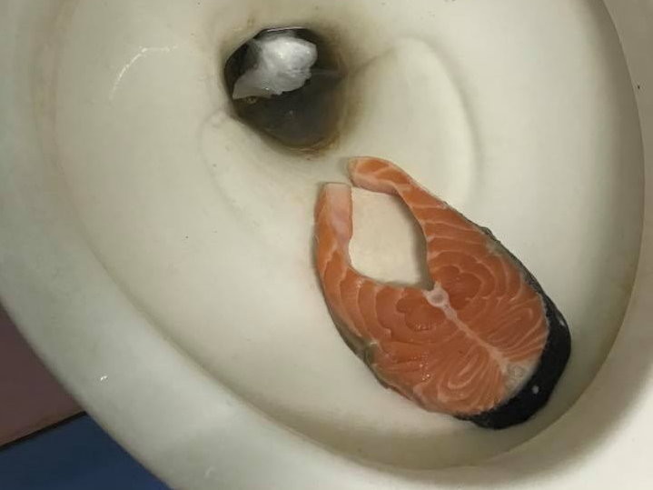 原PO在「爆廢公社」發文,並貼出當時的「慘況」,只見一塊鮭魚就貼在馬桶上緣,水裡頭則有一團衛生紙,引發熱烈迴響,也被「爆料公社」臉書粉專轉分享。
