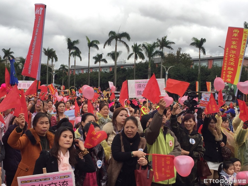 「兩岸交流30年踩街嘉年華」今天在台北市中正紀念堂廣場盛大展開,由中華兩岸婚姻協調促進會發起,並廣邀台灣新住民協會、新移民勞動權益促進會等48個團體參與,現場聚集將近2千人。由於活動以「深化交流,融合發展,兩岸一家親,牽手心連心」為主軸,其注意事項還特別提及,「不要拿政黨旗幟及五星旗幟,這不是政治活動,完全是和平紀念活動。」