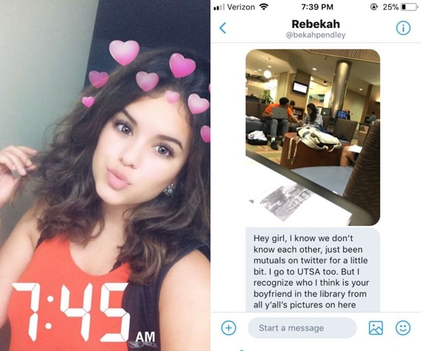 潔絲米12日在Twitter上表示,她收到一個名叫蕾貝卡(Rebekah Pendley)的女孩的訊息,對方表示,「嘿女孩,我知道我們彼此不認識,但我跟妳上同一所大學。我剛剛看到了一個我認為是妳男友的人,他在圖書館跟一個女孩在一起,而且他們有不少肢體接觸。我真的不知道是不是應該告訴你這些,但我之前曾經被劈腿過,同樣身為一個女孩,我希望妳能知道。」