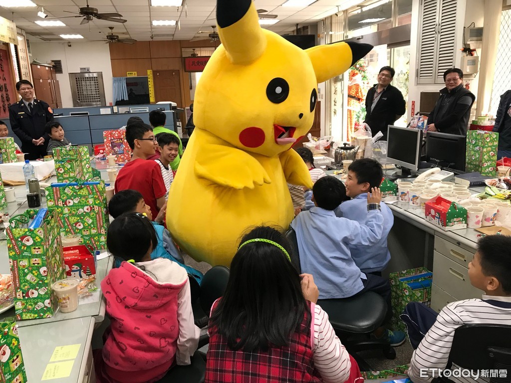 ▲員警除佈置聖誕樹及聖誕裝飾,還特別扮成「大型皮卡啾」及「聖誕老公公」與學童一同歡樂。(圖/警方提供)