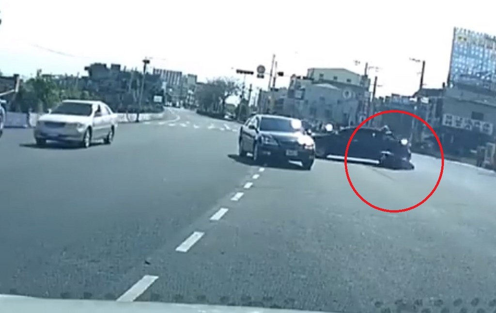 ▲轎車大迴轉,機車騎士反應不及,撞擊倒地。(圖/翻攝自爆料公社,下同)