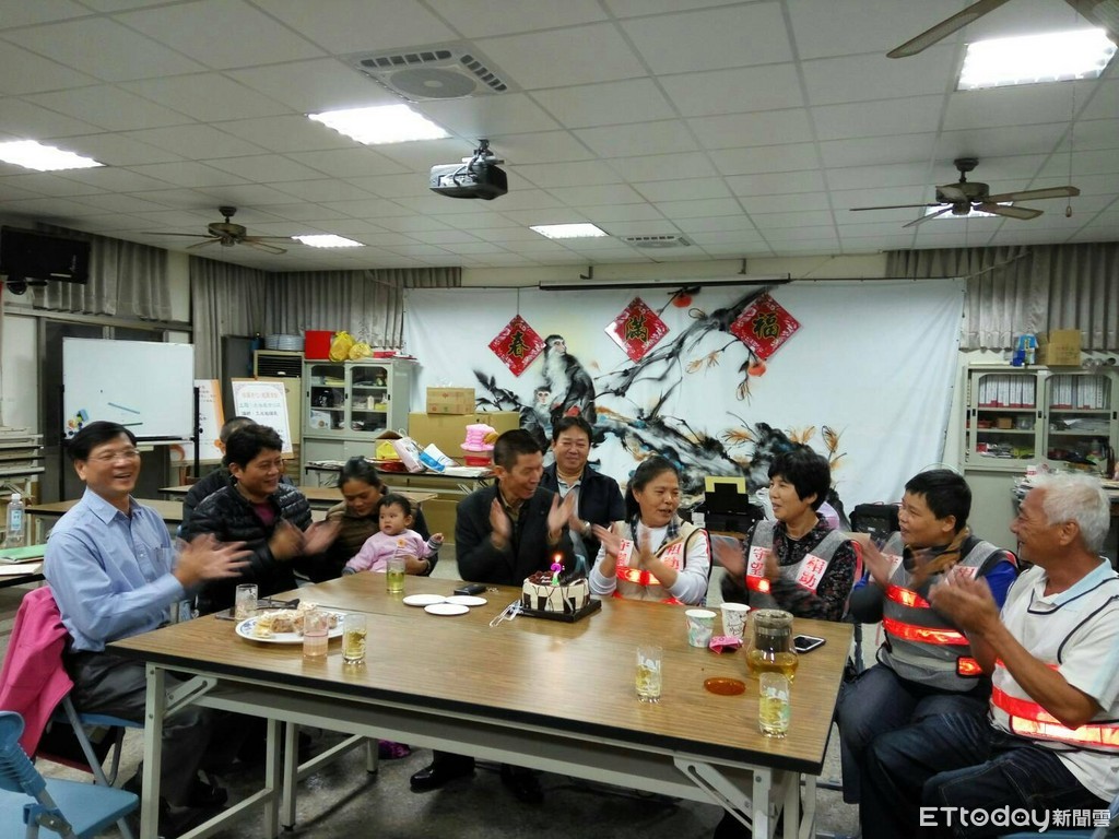 ▲台南市警六分局長吳清飛,晚間利用『明德社區守望相助隊』巡邏時段前往訪問慰勤,並祝賀隊員林雪真女士生日快樂。(圖/警方提供)