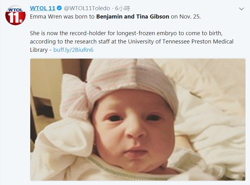▲25歲女順利生下被冷凍24年的胚胎,意外創下了世界紀錄。(圖/翻攝自WTOL 11的推特)