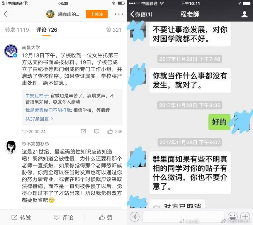 大陸南昌大學國學研究院一名已經畢業的學生小柔(化名),日前在網上爆料指控,自2016年12月開始被周姓副院長多次強行抱抱親親、猥褻、性侵長達7個月。期間周副院長更以會「影響畢業」來威脅她,讓她相當害怕而不敢報案。小柔多次尋死、痛不欲生。如今經過心理輔導後,才決意站出面揭露此事,以免有更多學生受害。