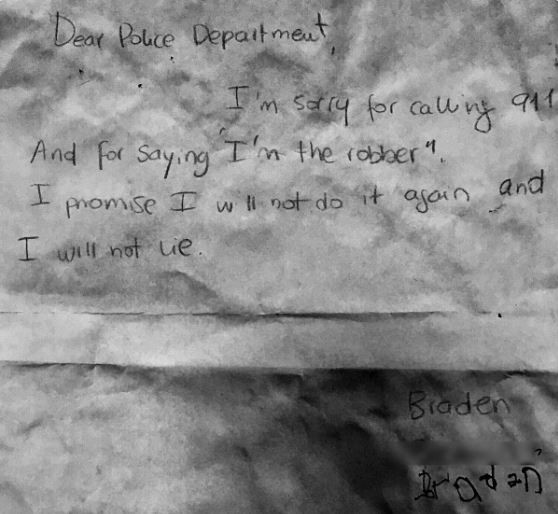警方表示,就在這件事發生沒多久之後,兄弟倆的母親便帶著他們倆到警察局自首,並拿出寫好的道歉信給警方,坦承這一切全只是惡作劇。照片顯示,6歲的布雷登(Braden)在信上寫道,「親愛的警察,我很抱歉假扮竊賊還撥打911。我保證我未來不會再做這種事,再也不會說謊。」4歲弟弟也同樣寫下類似內容的信給警察,請求他們原諒。