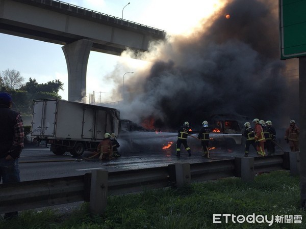 事發於21日下午3時許,國1南下林口路段41.3公里處發生6車連環追撞事故。警消獲報趕到現場,3輛車追撞燃燒,來幫忙的拖吊車見到這幕也被嚇壞,不敢貿然靠近。只見3車陷入一片火海中,燒成火球,火勢猛烈不斷竄出濃煙,夾雜爆炸聲響,畫面觸目驚心。