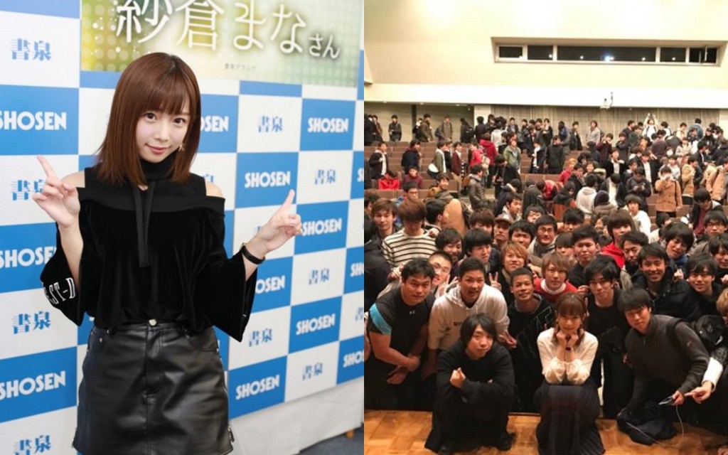 紗倉真菜也把演講照片PO上推特,學生們不但都非常捧場、台下坐無虛席,下課休息時還紛紛搶著提問、握手合照、跪求簽名;演講結束後學生們也多數都給紗倉真菜正面評價,同時「コンテンツ応用論」也意外成為當天推特的熱搜關鍵字,其他教授看了都忍不住說,「要是平常上課都這麼認真就好了。」