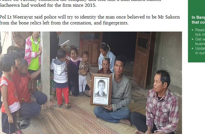 巧合的是,沙功的家人在今年5月18日接獲曼谷警方通知,說他因為血液感染死亡;一家人悲傷地趕到曼谷指認遺體,但死者的牙齒整齊與沙功的一口亂牙不同,於是提出質疑。當時警方僅表示,他們在遺體身上發現沙功的身分證以及員工證,向員工證上的公司詢問也得到證實。