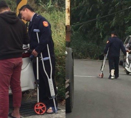 ▲員警拄拐杖和駕駛作筆錄。 (圖/翻攝自嘉義縣議員詹琬蓁臉書,下同)