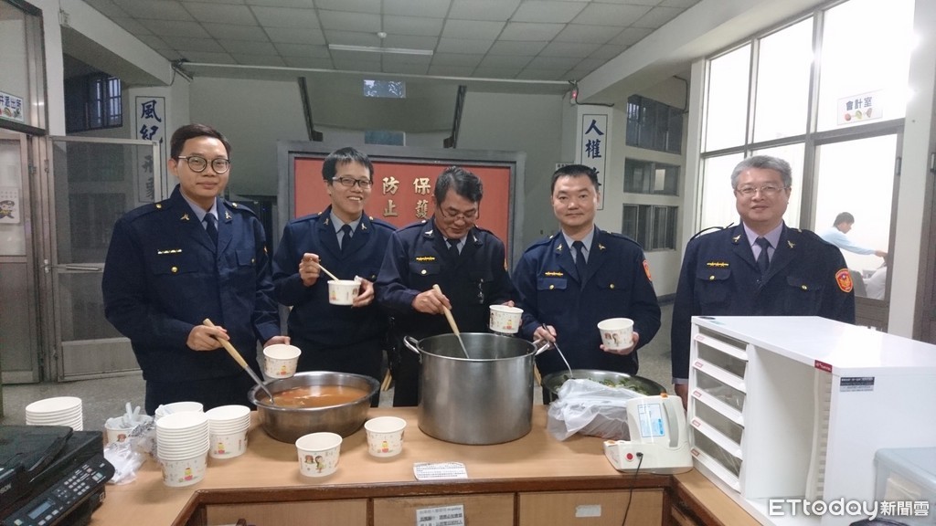 12月22日是「冬至」,欣逢此節氣,台南市警玉井分局長楊華中,感念今年分局同仁陞職、結婚生子、勤勞不懈為分局付出,與警友會玉井辦事處邱炳煌主任,特別準備湯圓慰勞員警平日辛勞(圖/警方提供),並期勉來年在各方面更加順遂、更上一層樓。