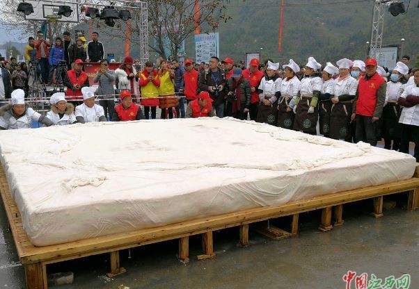 上海大世界基尼斯到現場測量,豆腐長3.88公尺、寬3.88公尺、高0.25公尺,獲得金氏世界紀錄認證,成為世界上最大的豆腐。據了解,製作團隊11日就已試做過一次,初衷是為了幫助當地的貧困家庭,所有豆腐認籌到的資金,將全部捐助貧困家庭和留守兒童。