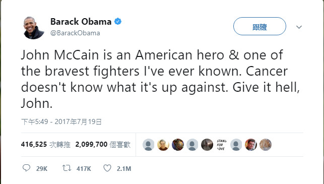 為歐巴馬在今年七月發布的貼文。歐巴馬發文為確診癌症的約翰·馬侃(亞利桑那州資深聯邦參議員)集氣,文章內容為,馬侃是美國的英雄,他也是我見過最勇敢的戰士。癌症並不知道在跟他退抗的對手是誰,馬侃,給他好看!