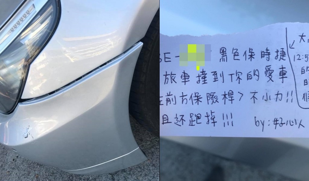 原來,目擊者在停車場親眼目睹一輛保時捷撞上BMW,車主居然假裝沒事默默離去,他心生不滿留下字條提醒。字條上寫著,「RBE-XXXX黑色保時捷休旅車撞到你的愛車(左前方保險桿),不小力!而且還跑掉!」最後署名是「好心人」,時間約是中午12點58分,不過他並沒有留下任何聯絡方式。