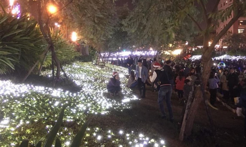 台中市政府表示,柳川的水中耶誕樹是全國首座,附近還有玫瑰花海,巨大禮物盒、浪漫鬱金香、橋下光廊道與七彩愛心樹等光景藝術,短短17天就吸引20萬人欣賞。然而,熱鬧的活動卻有人踩進草皮,讓大片的燈海變成有數個「黑點」,不少LED也破損。