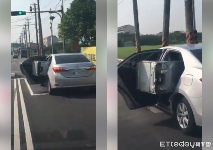 如果買東西的時候家裡有車就好方便運送,但是有看過轎車載冰箱的嗎?網友在臉書「爆料公社」上傳一段影片,只見遠處一輛豐田銀色轎車正在行駛中,但奇怪的是後座左邊的車門竟然是打開的,且還凸出一截冰箱,畫面相當驚險,讓原PO也無奈直呼,「三寶車當貨車用。」