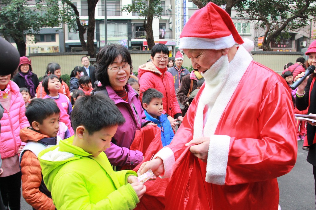 ▲徐耀昌扮演耶誕老人送孩童糖果,與長者共餐,另類展現施政3週年成果。(圖/苗栗縣政府提供)