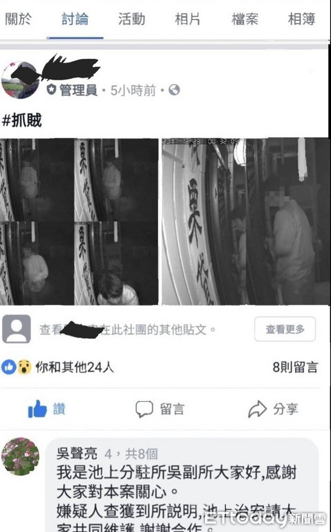 ▲竊嫌自知難逃法網,向警方坦承犯行,池上分駐所吳副所長立即PO文地方社群回覆謝謝合作。(圖/台東縣警察局提供 下同)