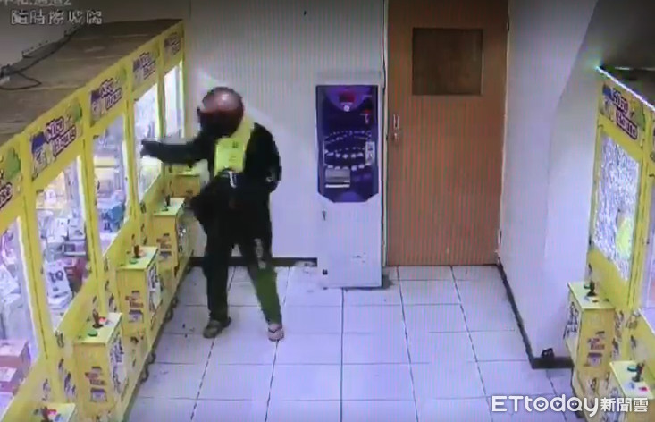▲男子身穿疑似警用雨衣,持BB槍射穿娃娃機玻璃,竊走價值6000元商品。(圖/記者林煒傑翻攝)
