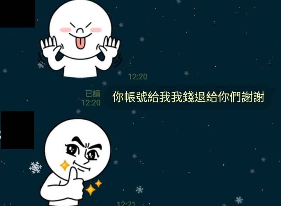 某A說「我聽到」,並附上一張饅頭人做鬼臉的圖;新郎回「你帳號給我,我錢退給你們,謝謝」;沒想到過一分鐘,某A先送上饅頭人按讚的貼圖,接著貼出銀行存摺帳號。