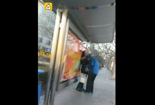 ▲大陸一對情侶在公車站親熱。(圖/翻攝自梨視頻)