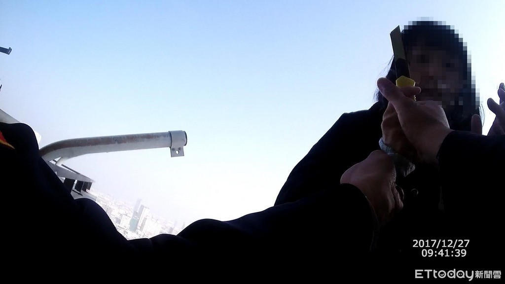 ▲發現該女子拿美工刀獨自一人坐在大樓頂樓女兒牆上,情緒極度不穩,且不停發抖並作勢要割腕自殺。(圖/記者林悅翻攝)