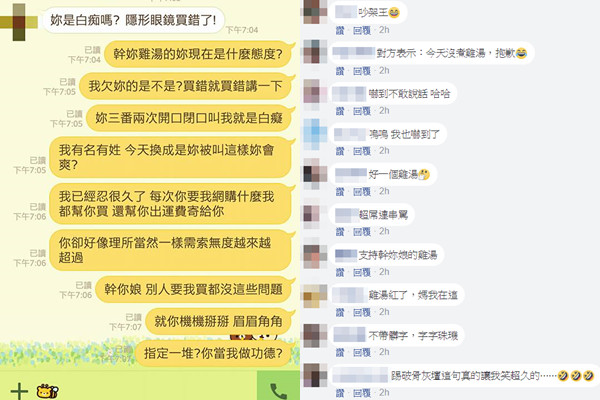 有女網友在臉書發文,說有朋友總是拜託她幫忙上網買東西,起初態度也很好,但她買錯幾次後,雖自行吸收再買對的給對方,可是對方態度卻越來越差,甚至嗆她「妳是白癡?」,讓她最後忍無可忍,爆氣連飆15句回嗆。對話被PO上網後,網友看了全都拍手叫好,直呼簡直大快人心。