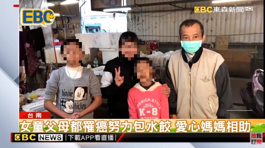 林先生和林太太在永康區「復國黃昏市場」賣豬肉和水餃,夫妻倆育有3名女兒,老大讀高中,老二和老三則是國小生。林先生先被檢查罹患口腔癌,剛開完刀,沒想到妻子也發現罹患乳癌末期,積欠20多萬元的醫藥費。林太太說,標靶藥物一個月要7萬多元。