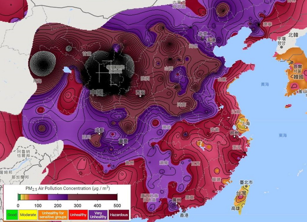 根據鄭明典貼出《Berkeley Earth》發布的PM2.5觀測圖,大陸全國的空氣汙染等級都在橘色以上,其中最嚴重的河西走廊地區,包含甘肅、寧夏等呈現「黑色等級」,看起來宛如「黑洞」,也就是超出尺標可監測範圍,空氣質量指數AQI為999破表。