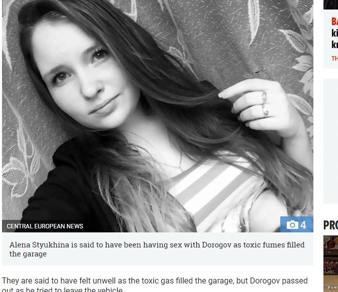 做愛環境也要保持空氣流通!俄羅斯15歲少女史艾蓮娜(Alena Styukhina)與22歲賽車手多羅葛夫(Artyom Dorogov)車震,「上下震動」太激烈沒注意到車內通風不良,最後一氧化碳中毒身亡。由於炮友艾蓮娜在多羅葛夫身下死亡,他以過失殺人、與未滿16歲未成年者性交等罪被警方逮捕。