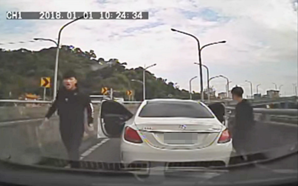 影片中,K網友開車綠燈起步,一路要上快速道路到台北,準備上橋時,右方一輛白色賓士突然向右硬是要往內切,他趕緊按喇叭示警,沒想到對方沒有剎車,反而跨越槽化線超車,接著猛踩煞車,大剌剌直接停在交流道口,車上的3名年輕男子一開門,手上還拿著槍枝,3名年輕男子一臉兇狠,2人還走走下車嗆聲,車上1人更疑似對空鳴槍。