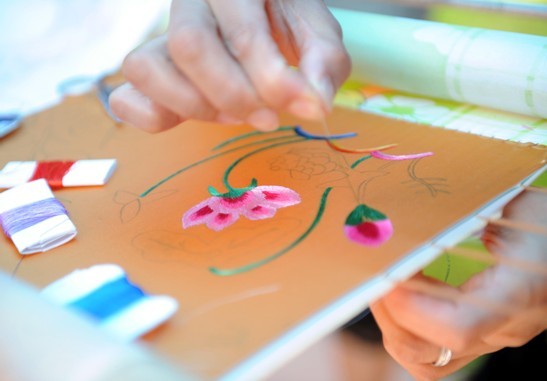 滿繡是一種融入了清代皇家元素的特殊刺繡手法。「秀麗的圖案、靈活的針法和精巧的繡工是滿繡旗袍的主要特徵。」滿繡坊旗袍設計師于豔說,「為了讓旗袍美麗而不凍人,我們選取了羊絨面料,在絨布上織繡難度更高一些,但是使旗袍的實用性更強了。」