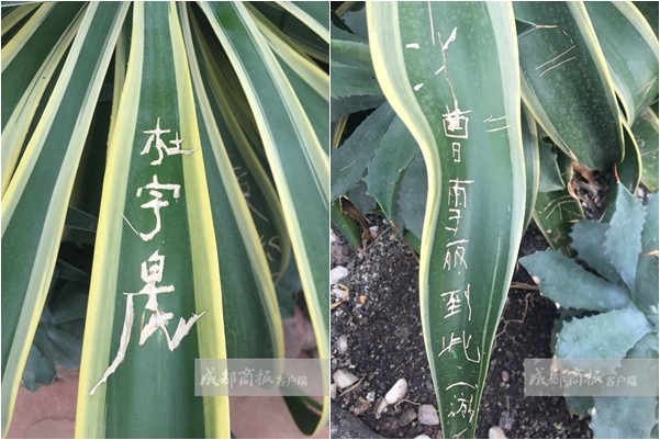 ▼最嚴重的一株龍舌蘭上共有40多片葉子全被刻了字,超過總葉片數量的一半。(圖/翻攝《成都商報》)