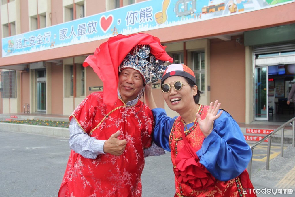 ▲自今(107)年起全國使用牌照稅將由稅捐稽徵機關自行徵收,台東縣稅務局長李素琴與台東監理站長周志昌(2)日巧扮成新郎、新娘,以古禮迎娶方式,宣告由台東監理站代徵40餘年的使用牌照稅業務,即日起回歸台東縣稅務局自徵。(圖/台東縣政府提供 下同)