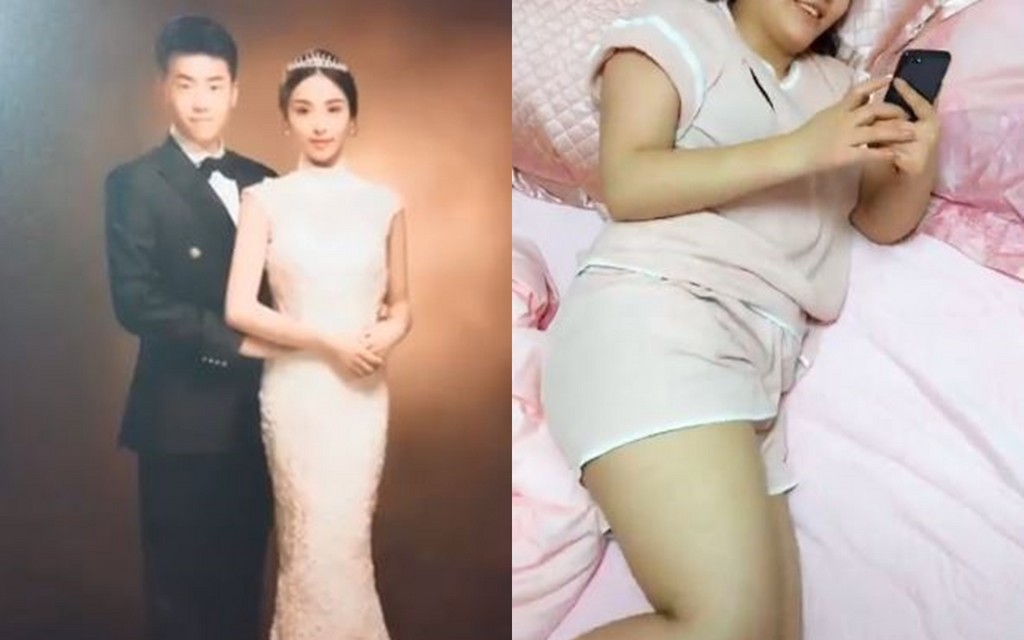 影片中可以看見,男網友先是拍攝了當初結婚時的美麗婚紗照,婚紗中妻子身材婀娜多姿,正面看過去還有一種完美腰身曲線,接著鏡頭下一秒轉拍了躺在床上悠閒滑手機的妻子,可以看出身材明顯比結婚時整整大上一號,妻子發現老公正在錄影還嬌羞了笑了一下。