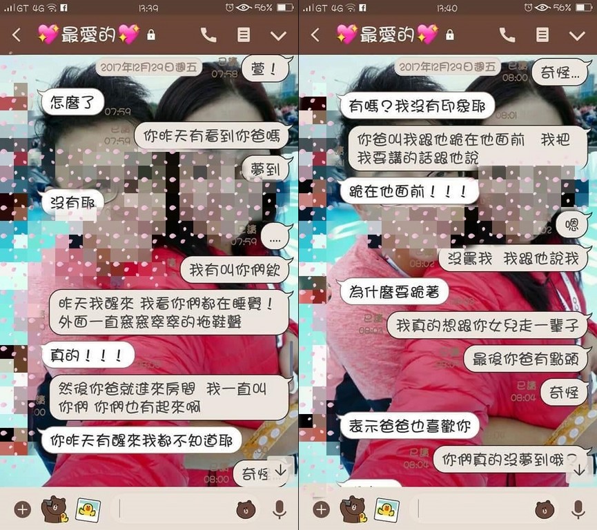 原PO說,他馬上叫女友,但對方怎麼樣都叫不醒,面對女友的爸爸質問「你是誰?」他則害怕地慢慢回答;「第一次這樣這麼清晰的看到靈體, 所以我嚇死了」,原PO表示,不久後,女友的爸爸便要求他跪下,他一跪下便說,「我很愛妳女兒我們也準備要結婚了!請他不用擔心我會照顧你女兒還有妳太太的」!