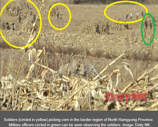 北韓面對國際嚴厲制裁,加上旱災導致農作物歉收,老百姓生活困苦,就連士兵也沒有足夠的糧食。《每日北韓》(Daily NK)近日釋出一張北韓士兵在農田裡偷玉米的照片,再次反映出北韓真實的生活並非如官方宣傳的一般。許多居民還看到士兵放2至3個月的公假,在田裡搜刮農作物。