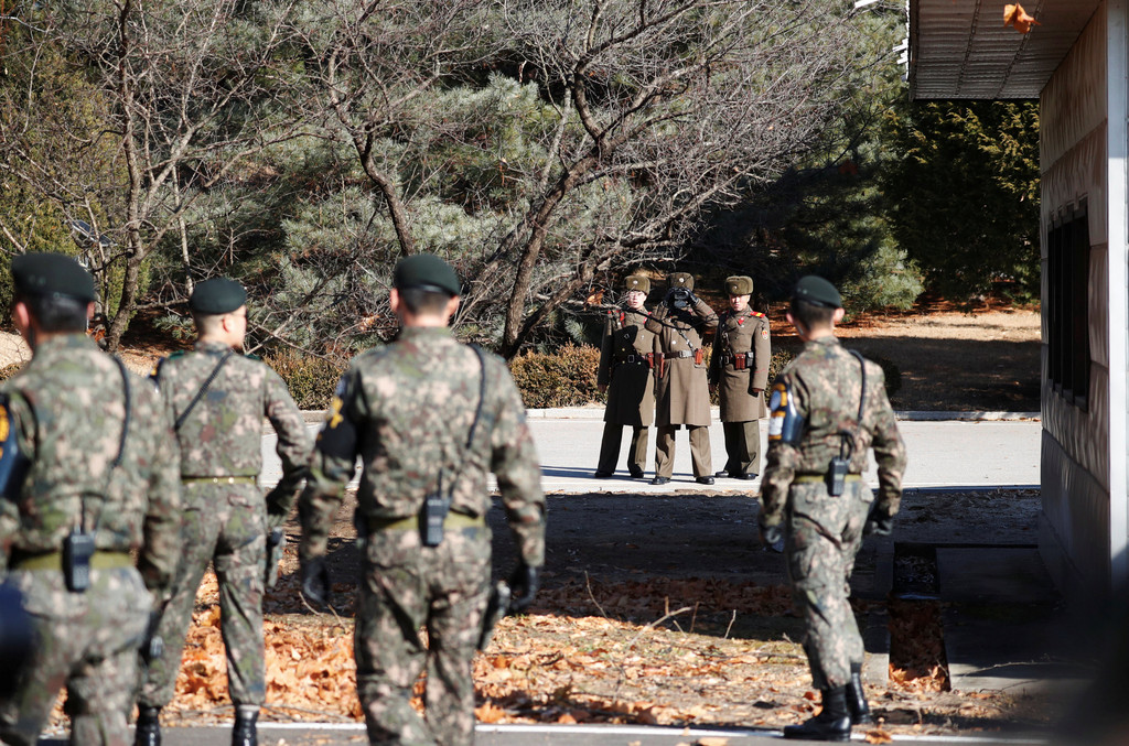 ▲南北韓軍人在板門店停戰區監視對方一舉一動。(圖/路透社)